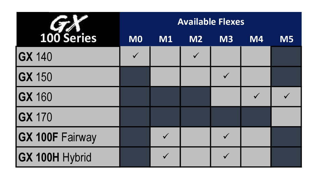 GX incorporates 3 distinct shaft profiles with ACCRA proprietary, Constant Flex Technology, DyMatch Technology, and Optimized S3 EI profiling.