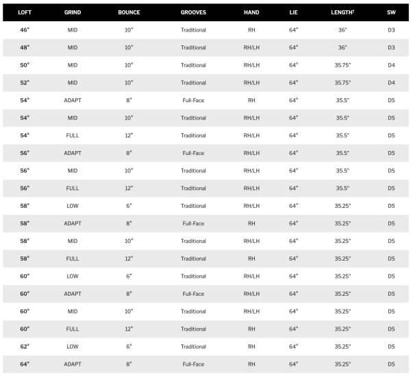 For classic groove length and head shape, select either FULL, MID, or LOW sole grinds. For Full-Face grooves and a higher toe profile, select the new ADAPT sole grind —the only full face groove option for this generation—crafted on tour for open-faced finesse shots.