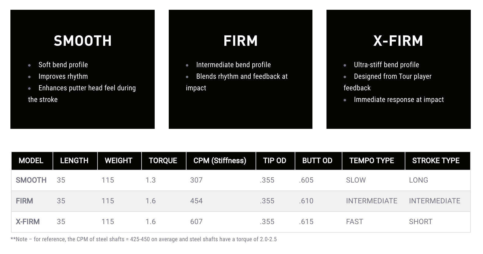 Each of the three graphite putter shaft models are 115 grams and feature MCT and RCT technologies for improved stability and softer feel due to vibration dampening over traditional steel. RCT in these shafts makes any putter feel and sound like it has an insert for softer feel at contact.