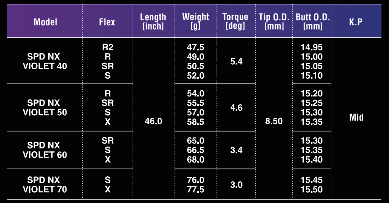 Speeder NX Violet – A similar bend profile to NX Blue with the torque tightened 10% in the tip and butt sections to increase speed and launch. NX Violet features all-new DHX Technology to optimize performance with higher MOI heads.