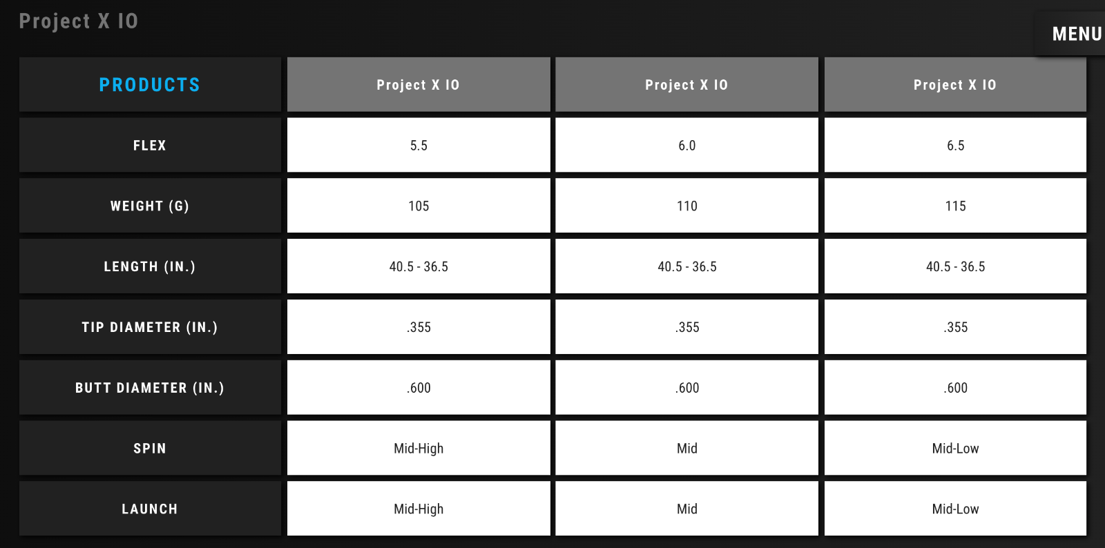 Project X IO takes the DNA of the popular PXi shaft and evolves it by having each shaft flex designed with a specific weight and trajectory progression in mind. As Project X IO increases in flex, it gets 5g heavier and is geometrically modified to launch lower–providing an individually optimized shaft for each flex.